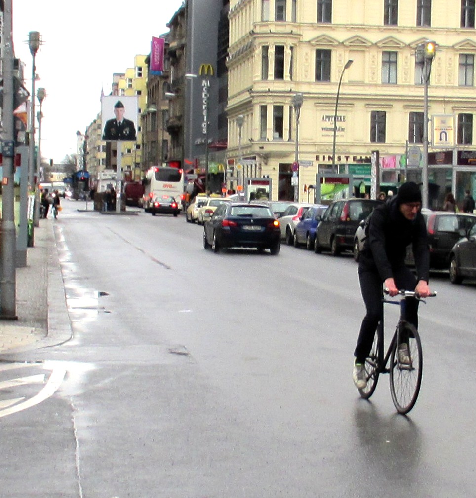 Fixie rider Checkpoint Charlie Berlin Published February 8, 2013 at 964 × 1010 in The unprepared tourist – an afternoon cycling in Berlin Rider on fixie heading away from Checkpoint Charlie
