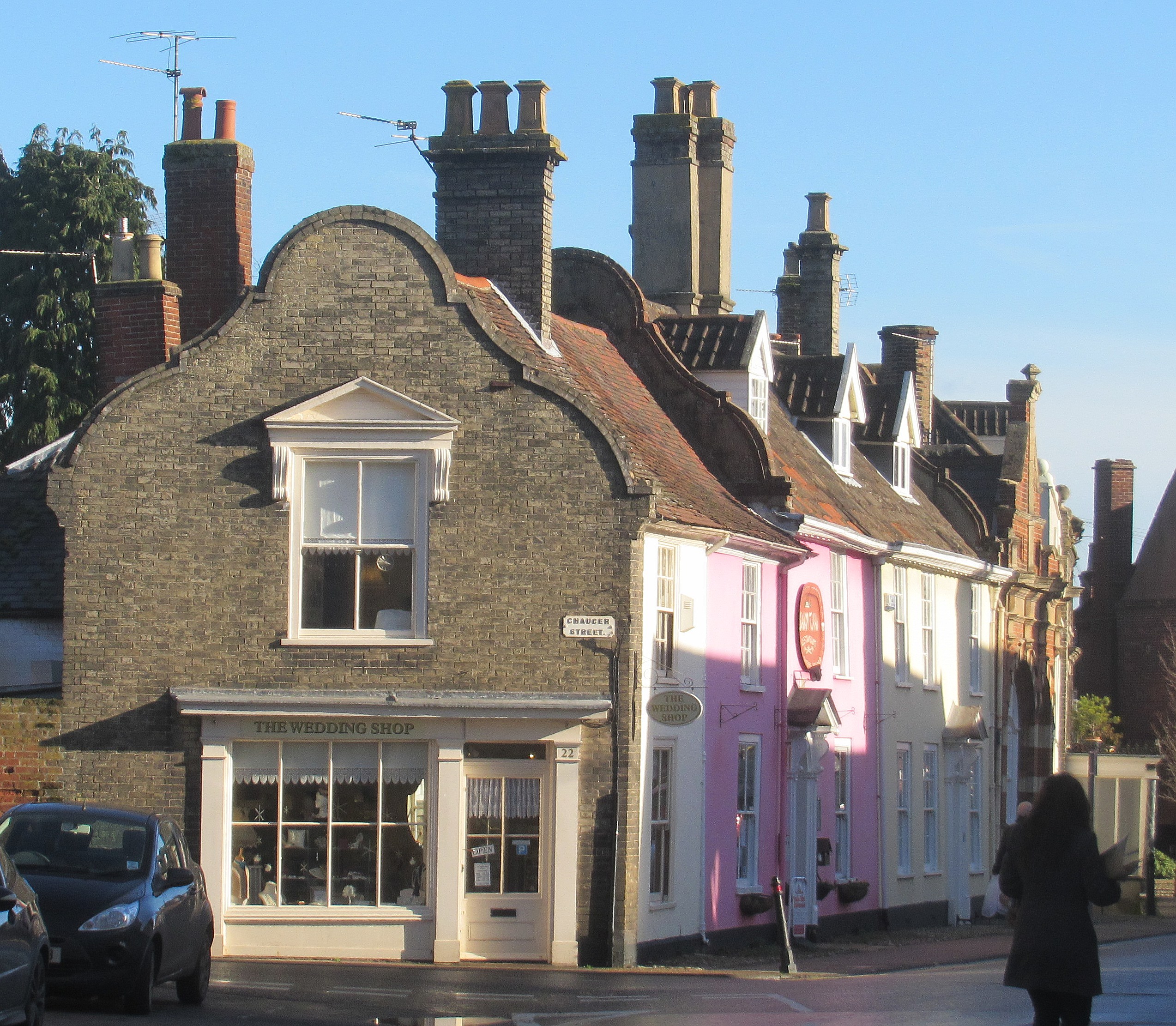 The first is the wonderful higgledy-piggledy architecture of the streets and back lanes that represent so many layers of history. Fine Georgian prosperity from when the town was a booming inland port in the 18th and 19th centuries. Red brick mixing with the bright painted render that makes Suffolk streets distinctive, together with the Dutch or Flemish influenced gable ends that would have come to East Anglia from its trading connections to Flanders and the building fashions of the 16th and 17th century.