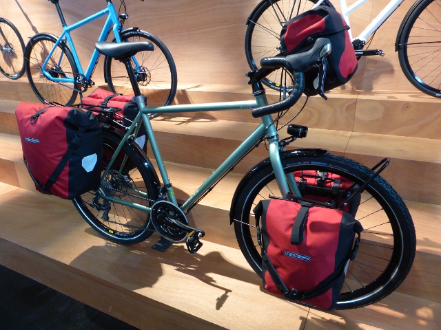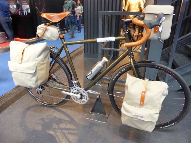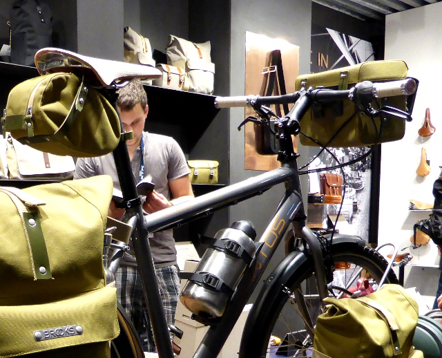 My “show-stopper” for 2014 came into that category. It was a Tout Terrain randonneur model, but what caught my eye was not the bike but the luggage and the fit out. A complete touring range by Brooks combining attractive fabrics with Brooks’ traditional leather trims.