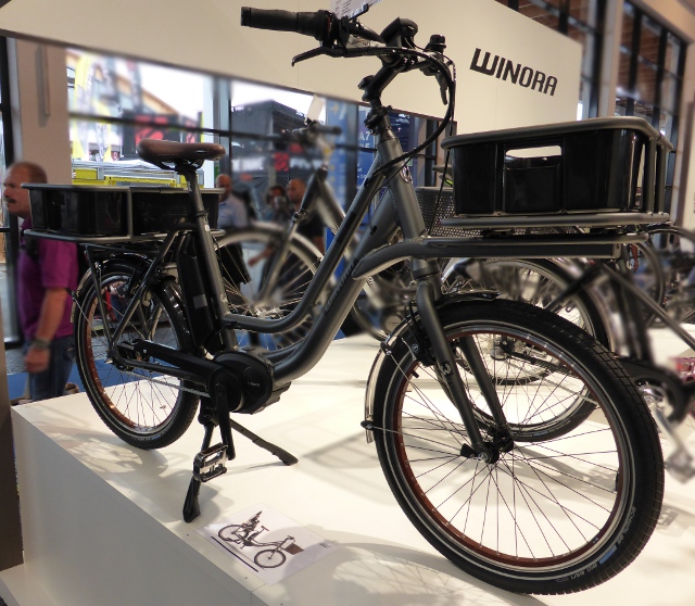 It may just be that the most important bike at the show was a bike called the E-load on the Winora stand. Winora is the German brand of Accell Group, the largest bike manufacturer in Europe and equally importantly one of the leaders in city bikes and urban bikes. At ECF we have been looking at the long term trend for delivery bikes of all kinds in the cities of the future. So far the emerging bikes in the commercial or professional delivery sector have been handmades and specialities but the entry of Winora this year and KTM last year with mass market bikes equipped for shopping and delivery could be a big breakthrough.