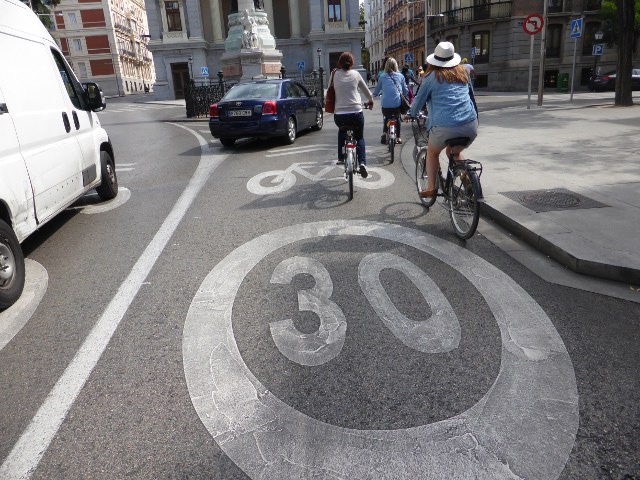 Cycling road markings and 30kmph marking Madrid Published September 28, 2014 at 640 × 480 in Cycling in Madrid – great potential but major frustrations