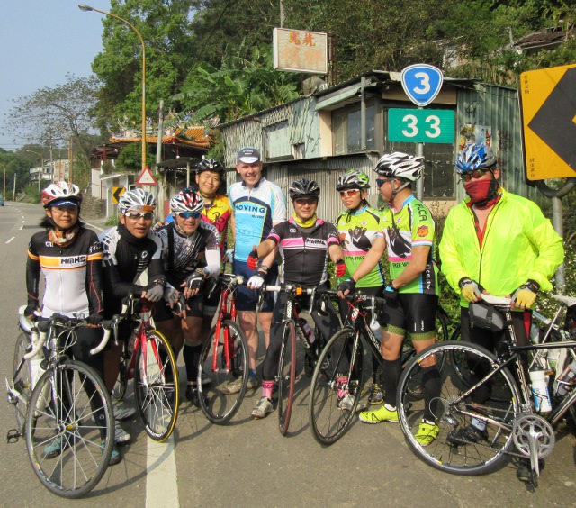 And I learned a little Taiwanese cycling tradition. Our first meeting point on Highway 3 was the 33km mark so we all had to stop to make that the official photo call. This is because the Taiwanese riders like to go out and collect road signs where the numbers match – kilometres 22 and 222 on route 2 for example. It is a sort of train spotting for cyclists, and I like it.