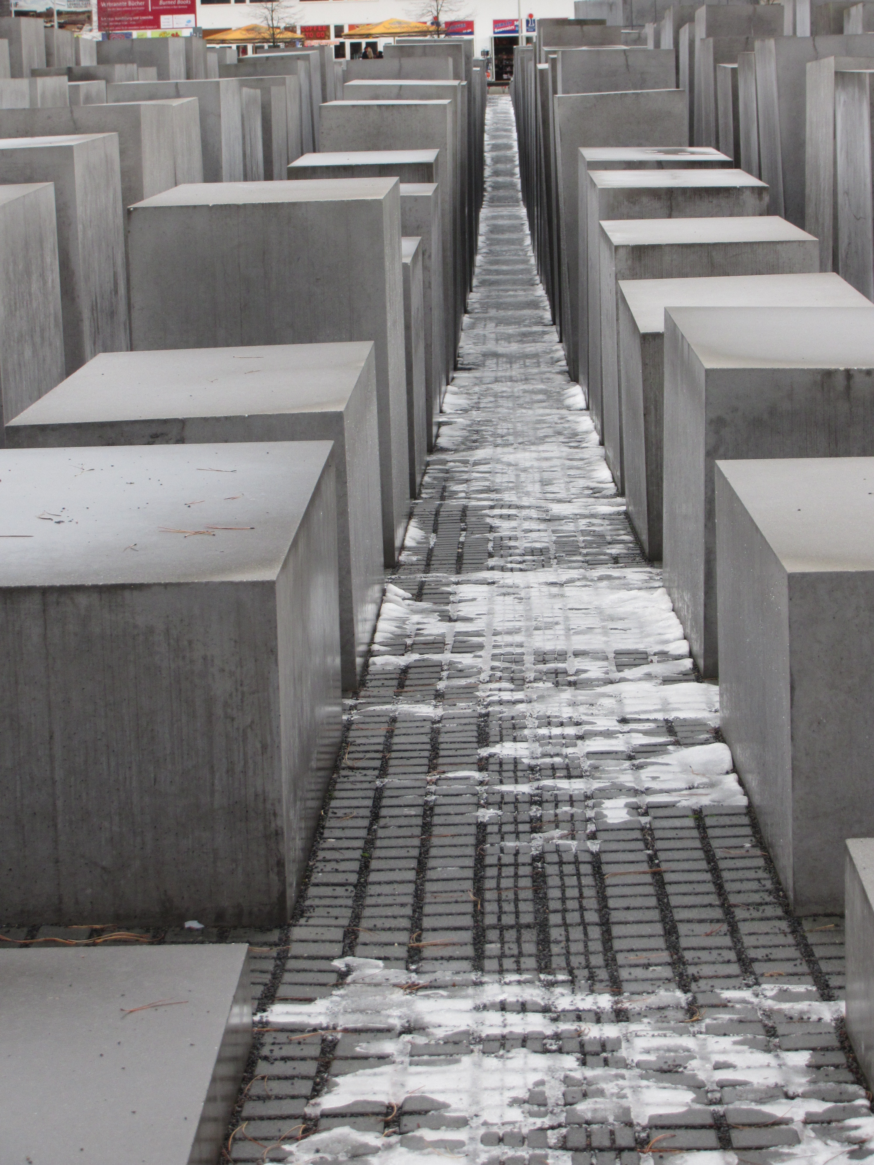 It turned out to be quite an odd ride, as if the city doesn’t quite know what to do with its legacy, or indeed it’s cycling. Heading south from the Brandenburg Gate towards Potsdamer Platz the road was obvious but almost all suggestions of the wall’s existence were gone. Instead the first landmark was the Holocaust Memorial, a sombre grey feature of large blocks laid out in a grid, completed in 2004. A moody place in the overcast sky and slushy snow.